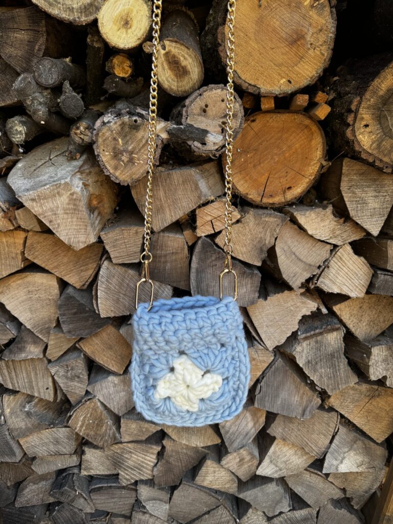 Nem okozott kevés dilemmát a táska pántja sem. Sokáig találgattam, hogy a táska anyagából készüljön-e a pánt, vagy inkább fém láncot válasszak hozzá karabinerekkel. Végül ez utóbbit választottam, mert a fonalból készült pánt itt nagyon könnyen boho hangulatot adott volna, ami most nem volt cél, és azt sem szerettem volna, ha a táska tarisznyás jelleget öltene. Ezért maradtam az ékszerszerű, városi megjelenítésnél és azt hiszem ez az a pont, ahol a klasszikus horgolás átfordult valódi karakteres kiegészítővé.